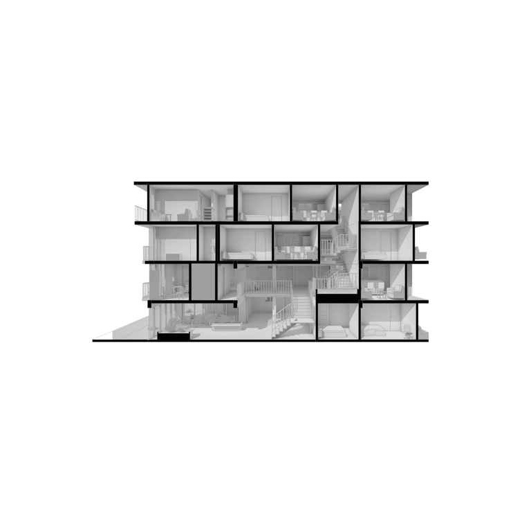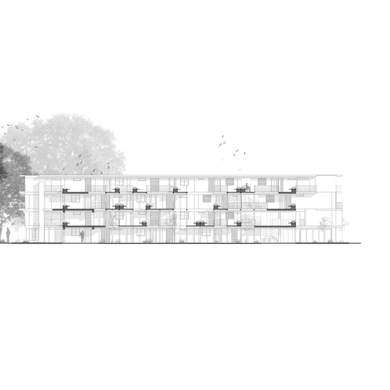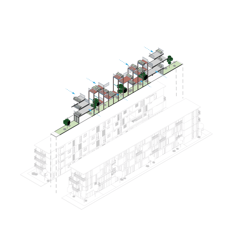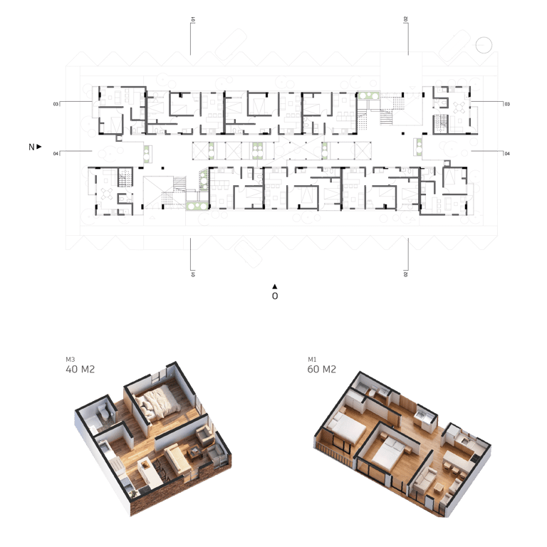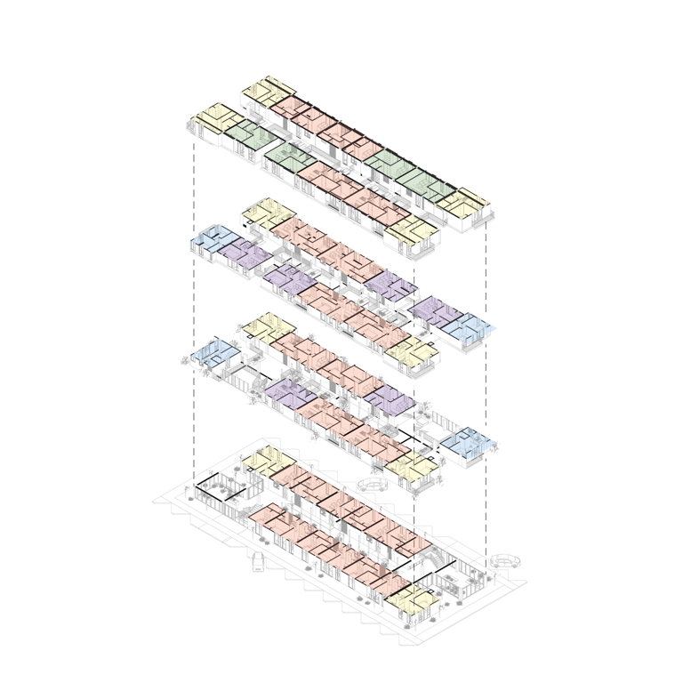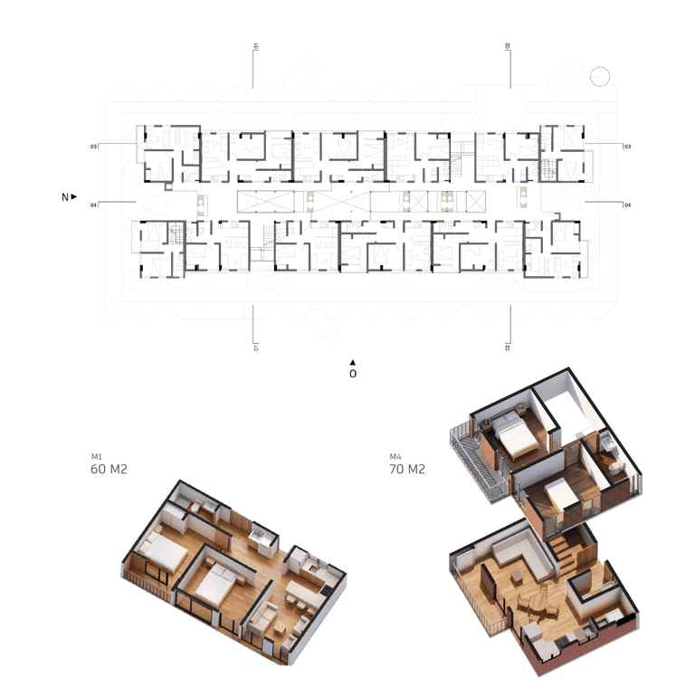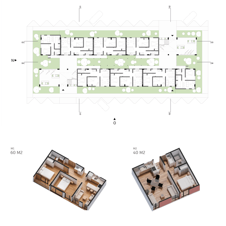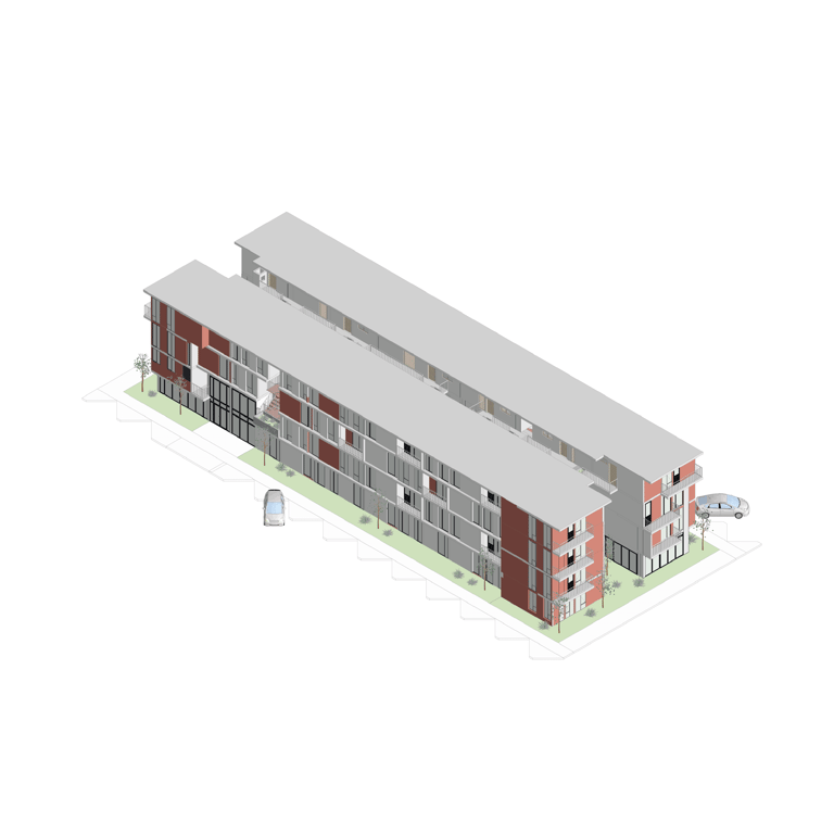 Se plantearon dos volumetrías separadas por un patio/conector colgante verde que fungiera como espacio de socialización. El complejo prioriza el uso de grandes visuales y el uso de vegetación endémica.